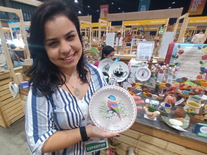 A diretora de Inovação, Letícia de Oliveira, e Tainá Tempopni (foto), da Secretaria de Turismo e Desenvolvimento Econômico da Cidade do Aço, estiveram representando o artesanato do município na Abav Expo, no Rio, em setembro. Apresentaram diversos trabalhos feitos pelos artistas locais. Entre os mais diferentes tipos de artesanato em cerâmicas, tecidos, madeiras, tecelagem e pintura, destaque para o arigó, que virou o xodó da cidade. Márcia Pires, uma das artesãs locais, já o exibiu, inclusive, numa exposição em Lisboa, onde lançou a Coleção de Xícaras Arigó.